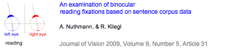 Nuthmann, A., Beveridge, M. E. L., & Shillcock, R. C. (2014). A binocular moving window technique to study the roles of the two eyes in reading. Visual Cognition, 22(3), 259-282. https://doi.org/10.1080/13506285.2013.876480